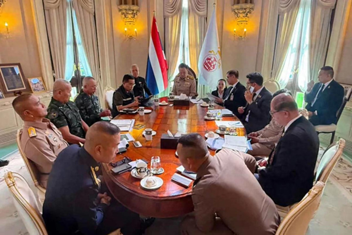 泰国总理阿努廷周一在政府大楼召开紧迫会议,议论泰柬边境的安全时事。